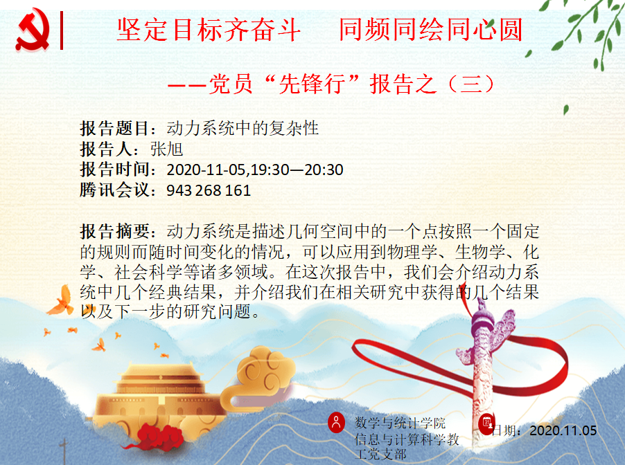 本站讯 2020年11月5日晚,万象城娱乐awc线路信息与计算科学系教工党支部于腾讯会议举办“坚定目标齐奋斗 同频同绘同心圆——党员‘先锋行’报告第三期”,本次活动由信息与计算科学系教工党支部书记亓兴勤主持,信息与计算科学系主任张旭副教授担任主讲人,学院党委副书记王鹏飞、信息与计算科学教工党支部成员和部分学生参加。