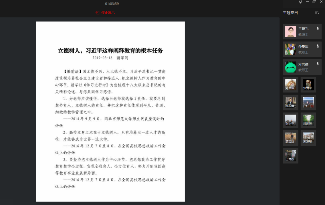 主题党日召开前,党支部成员认真学习习近平总书记关于教育的重要论述,并就落实立德树人的根本任务进行了深入思考。主题党日上,支部党员进一步集中学习了《立德树人,习近平这样阐释教育的根本任务》、《习近平总书记在北京大学师生座谈会上的讲话》等,并就学习内容进行了充分的研讨和交流。