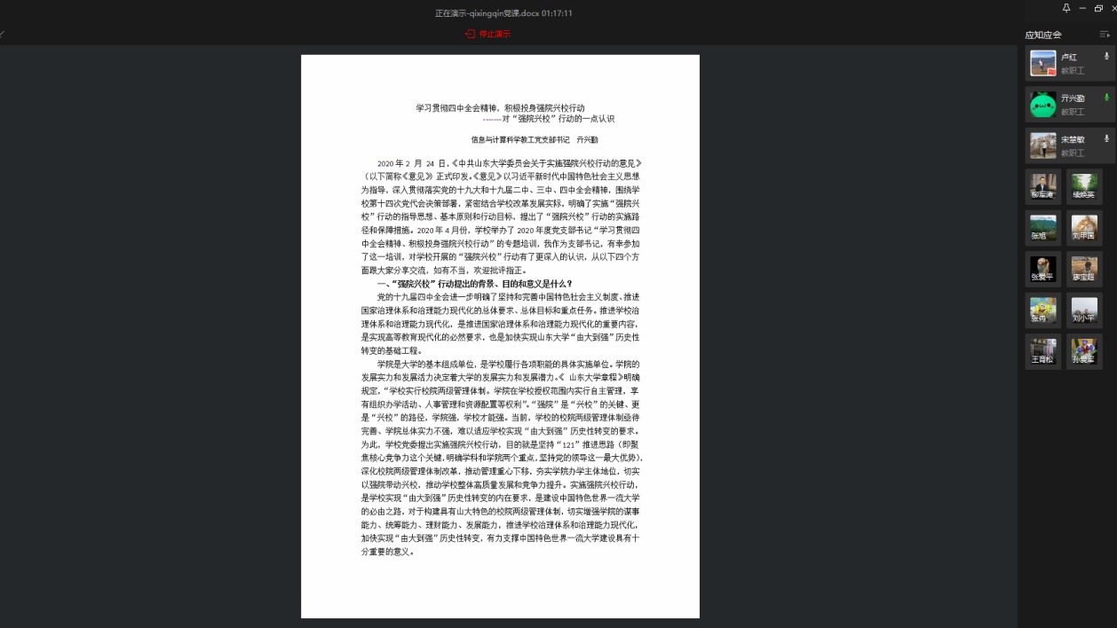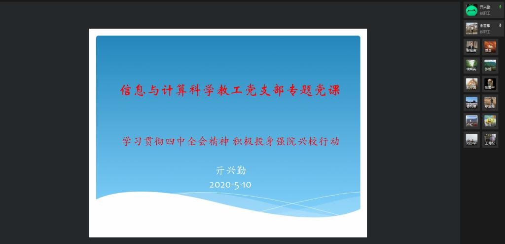 本站讯 5月10日晚7点,万象城官网信息与计算科学系教工党支部通过企业微信召开了以“学习贯彻四中全会精神,积极投身强院兴校行动”为主题的支部书记上党课,支部成员围绕强院兴校行动积极研讨、建言献策。