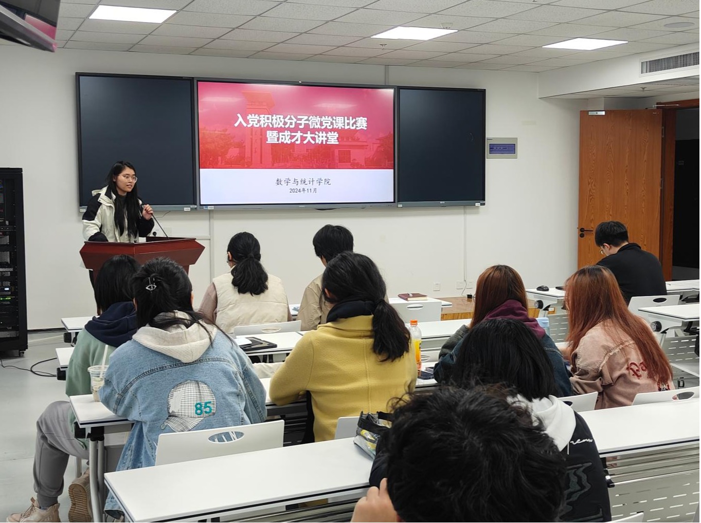 为引导学生立报国强国大志向,做挺膺担当奋斗者,11月14日下午,万象城娱乐awc线路于北衡楼1420室开展入党积极分子微党课比赛暨“青春献给祖国,青年挺膺担当”成才大讲堂活动。辅导员陈楷丰、崔巍、严粢业,学生党员柳宿辰、常聪颖担任评委,49名入党积极分子分为七组参加本次活动。活动由辅导员崔巍主持。