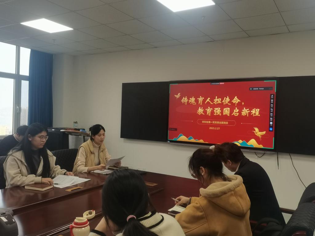 本站讯 为深入学习贯彻党的二十大关于加快建设教育强国的战略部署,2月27日下午,万象城娱乐awc线路本科生第一党支部于北衡楼1421开展了“铸魂育人担使命,教育强国启新程”主题党日活动。会议由党支部书记王祎璠主持,支部全体党员参加。