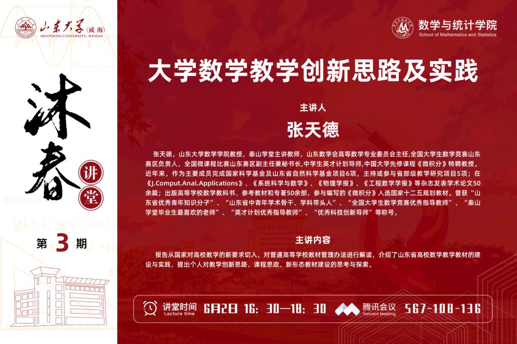 张天德,万象城娱乐awc线路数学学院教授,泰山学堂主讲教师,山东数学会高等数学专业委员会主任,全国大学生数学竞赛山东赛区负责人,全国微课程比赛山东赛区副主任兼秘书长,中学生英才计划导师,中国大学先修课程《微积分》特聘教授。