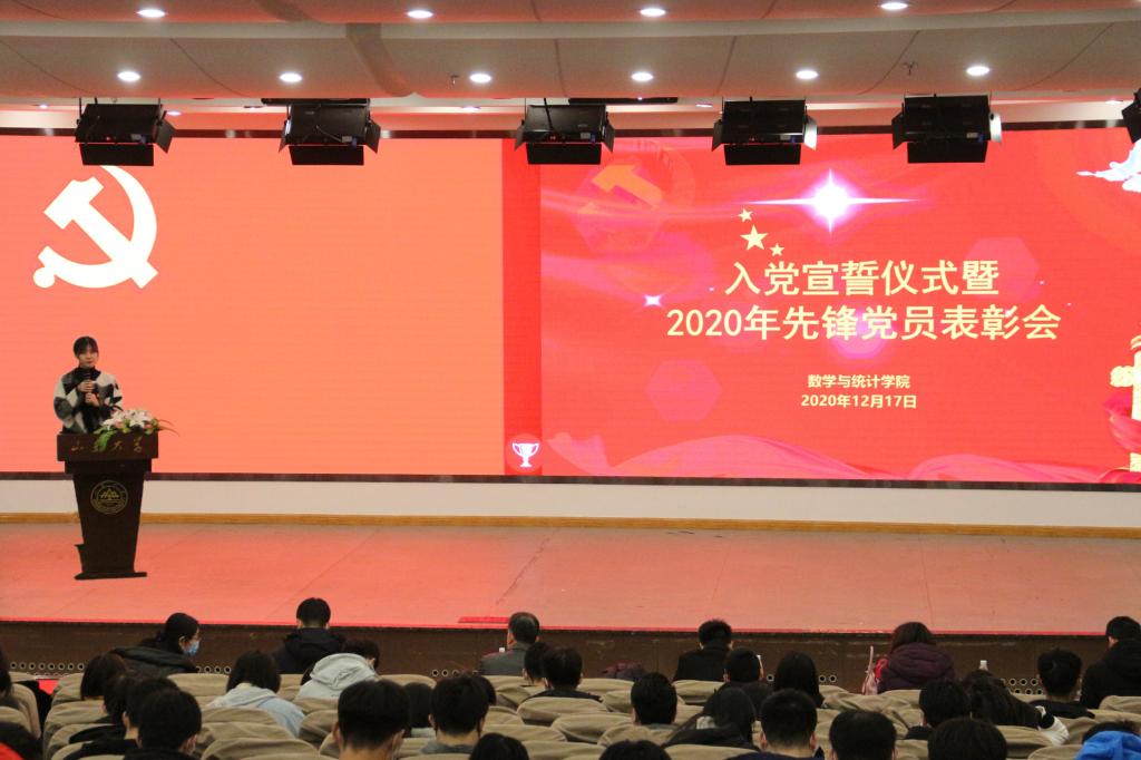 大会在雄壮的《国际歌》中开始,学院党委副书记王鹏飞宣读参加宣誓的预备党员名单。在学院教师党员、统计系系主任王效强的带领下,新发展预备党员面向党旗,紧握右拳,庄严宣誓。宣誓后,2017级统计学专业董书涵作为正式党员代表发言,她分享了党组织培养下个人思想成长的历程,勉励新发展的党员同志勇立潮头,锐意进取,做有理想、有本领、有担当的新时代青年,在实现中国梦的生动实践中书写人生华章。2018级数学与应用数学专业许鑫代表新发展的预备党员发言,感谢党组织的关心、培养和教育,表示将以实际行动践行誓言,坚定信仰,努力学习,勇于担当,向成为一名优秀的共产党员不断迈进。在表彰环节,与会领导、教师党员分别向学院优秀共产党员、优秀党务工作者、先进基层党组织、抗疫服务优秀党员、学习先锋等先进个人和集体颁发了证书和奖品。