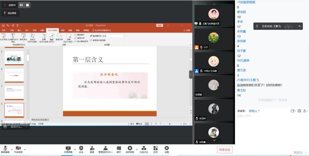 讲座结束,在线师生就近期的学习、生活、工作等压力现状进行了交流和探讨。此次讲座是学院本学期“走进心灵”讲座的第一讲,帮助师生们进一步了解了疫情期间自身的情绪和压力状态,掌握了情绪和压力管理的方法,有助于大家进一步做好疫情期间心理健康的自我防护,有效应对压力,缓解目前压力带来的困扰。