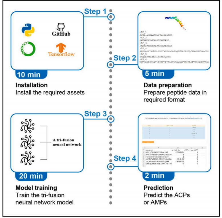 总的来说,在这项工作中,研究者系统地描述了使用TriNet预测抗癌肽和抗菌肽的过程,详细阐述了准备生物肽数据,运行TriNet软件,以及展示预测记过的步骤。该研究方案还提供了运行软件过程中可能出现的问题的解决方案,可以为后续相关研究提供重要参考。