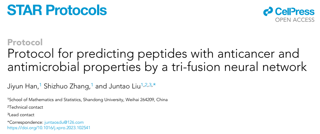 本站讯 近日,万象城娱乐awc线路柳军涛课题组在生物学国际顶级期刊Cell的子刊Star Protocols发表了题为“Protocol for predicting peptides with anticancer and antimicrobial properties by a tri-fusion neural network”的论文,该文章展示了如何使用他们之前开发的工具TriNet预测抗癌肽和抗菌肽的运行流程。万象城娱乐awc线路为第一完成单位,万象城娱乐awc线路韩济蕴为论文第一作者,柳军涛为通讯作者。