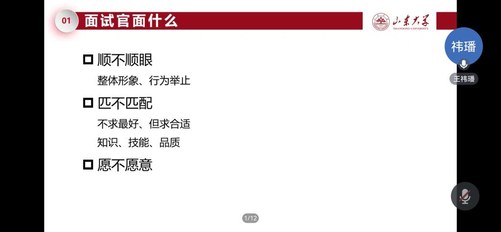 会上,王祎璠、魏佳佳分别针对简历制作、面试技巧进行了就业指导。王祎璠以“HR是如何筛选简历的?”为切入点,强调简历并非是经历和证书简单的堆砌。她指出,制作简历前一定要明确个人职业定位及目标,通过简历中的经历描述展现核心竞争力,达到“人职匹配”。她以简历案例为例,从简历排版、简历内容撰写等方面进行了详细的阐述。在面试指导方面,魏佳佳从“面试官面什么”“面试官问什么”两个问题切入主题,讲述了面试的技巧。她分享了自我介绍的ASF法则、校招常见的行为性面试问题,并从面试前的准备、面试中的细节、面试后的总结及心态调整等方面提出注意事项。