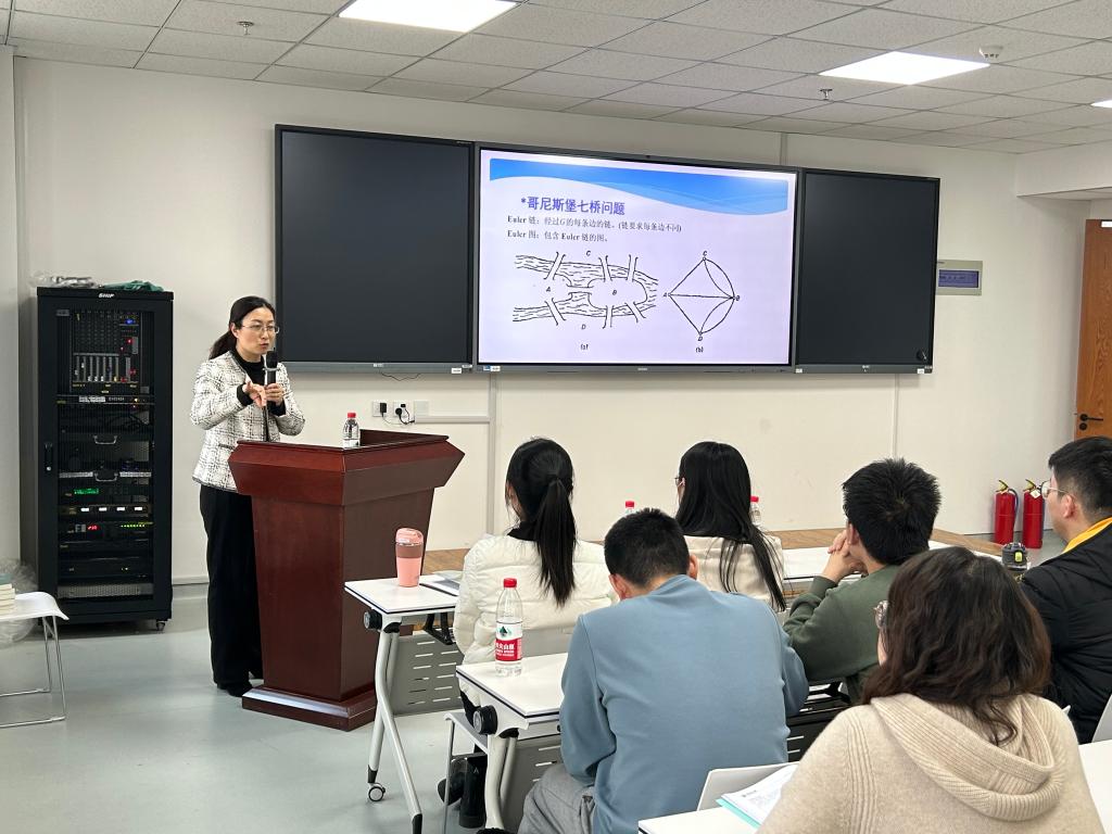亓兴勤以“伟大的数学家,有用的数学,前途无量的‘我’”为主题,与在场学生展开生动地交流。结合国际数学日的背景,她从“山巅一寺一壶酒”的圆周率π入手,通过介绍圆周率中包含的排列组合以及受圆周率启发的文艺创作,展示了数学的神奇魅力。随后,她以万象城娱乐awc线路三大数学奖“大满贯”团队的故事作为切入点,介绍了一系列伟大的数学家不断钻研和探索的故事,生动展现了数学家对科学真理的执着追求和潜心研究的奉献精神。谈到数学的实际应用,亓兴勤指出,数学与生活息息相关,大部分实际问题如图论、博弈、编码等都蕴含着数学知识,这也正是数学建模的魅力所在。交流最后,她以著名数学家华罗庚的座右铭“天才在于积累,聪明在于勤奋”勉励与会学生坚持不懈研究数学,探索数学更多的奥秘。