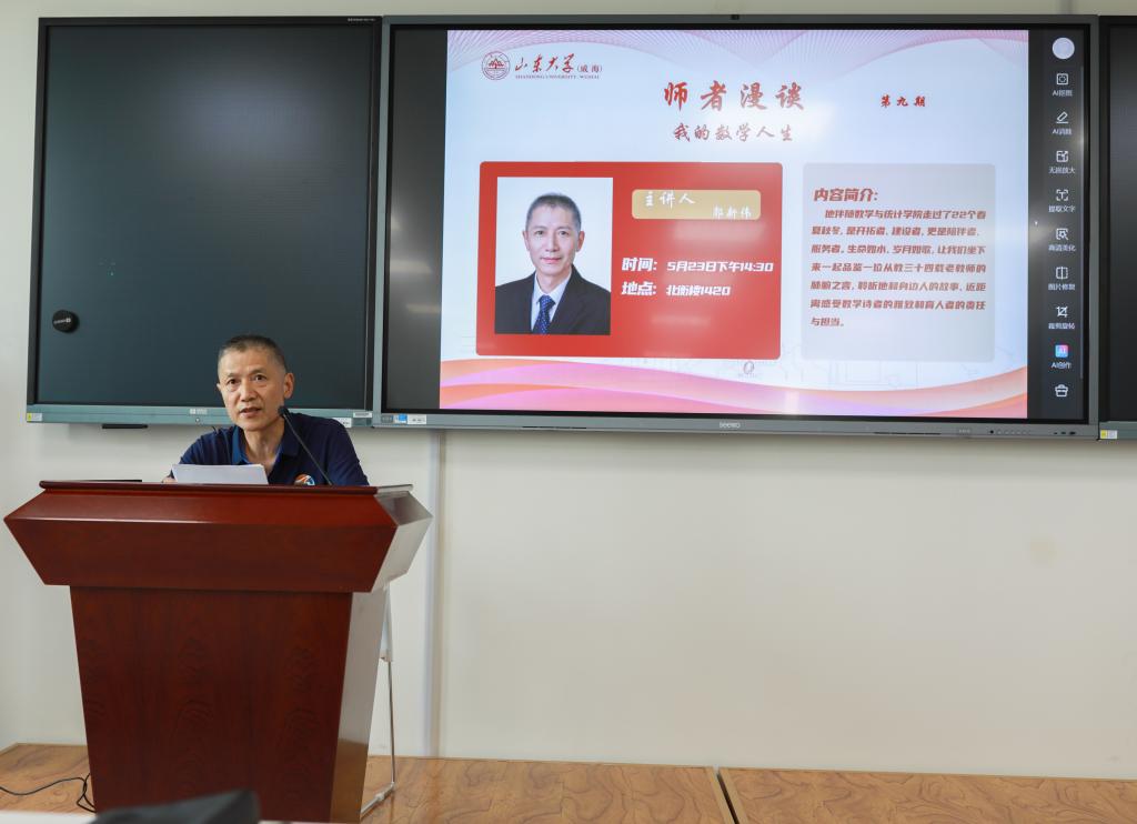 郭新伟教授伴随万象城娱乐awc线路走过了22个春夏秋冬,是开拓者、建设者,更是陪伴者、服务者。讲座中,他结合个人四十余载的求学和从教生涯,从时间的脉络、环境的优化、身边人的故事三个维度分享了所历、所思、所悟。他用生动的讲述回顾了威海校区办学40年的蓬勃发展,追忆了数学系从成立到改系建院的奋斗历程,分享了一届届数学人笃定前行的历历往事。他说,“传承”是山威数学人的“关键词”。自校区数学系创建以来,山威数学人聚力坚守着数学人的初心,勠力秉承着数学人的本性,接力承担着数学人的崇高使命。他勉励与会的青年教师和学生,要继续传承这种数学人的精神,勇于探索,开拓进取,找到人生的最优坐标,在更大的宇宙空间中释放能力、发光发热。