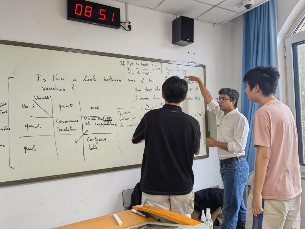 《统计学概论》由法国国家级科研机构INRAE的 Mahendra Mariadassou教授担任主讲,共16学时,该课程首次采用线下授课模式。Mariadassou教授以浓厚的学术功底和丰富的实践经验,结合生动的实际案例,讲解了统计模型的基础知识,如概率分布、抽样理论、参数估计、假设检验等统计学中核心内容。Mariadassou教授讲解不仅条理清晰,而且充满激情。同学们系统地掌握了统计学的基础知识,更重要的是开始意识到统计学作为一门具有广泛应用价值的数学分支,在解决实际问题中发挥着不可替代的作用,深刻理解了统计学是如何将复杂的现实问题转化为可分析的数学模型,从而揭示数据背后的规律和趋势。