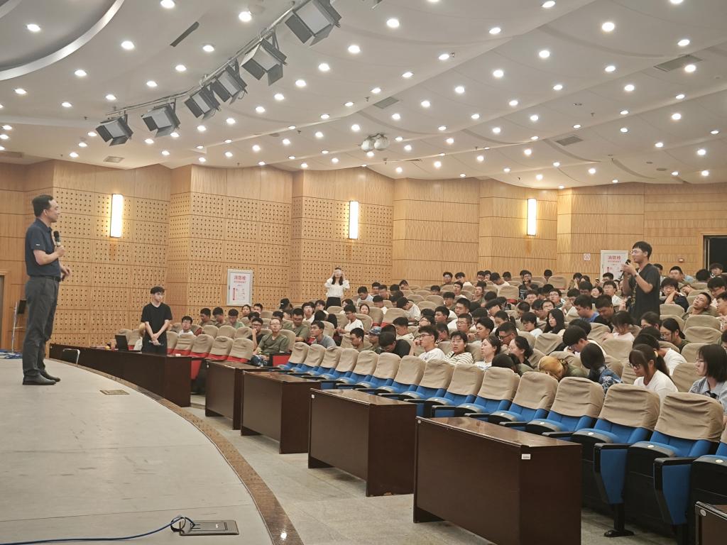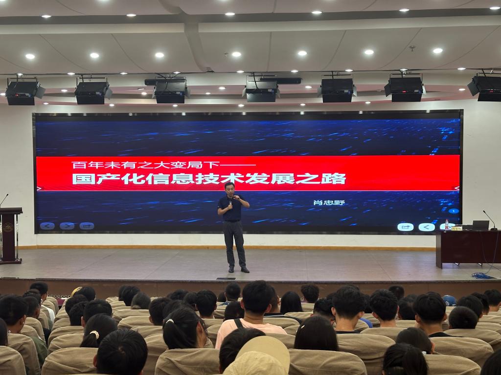 肖忠野介绍了当前国内信息技术产业公司发展现状,分析了产业发展面临的严峻国际形势,指出了当前科技公司面临的竞争压力和挑战。他提出,信息产业任重道远,发展自主可控的信息技术产业迫在眉睫、刻不容缓。以芯片产业为例,他详细分析了什么是“卡脖子”问题,结合中科曙光的发展历程,探讨了信息技术产业未来的发展趋势和形势。他激励学生,要以国家需求为己任,勇担历史使命,锤炼意志品格,丰富知识涵养,保持积极乐观的心态,顺应时代发展趋势,为国家科技创新、社会繁荣发展不断研究学习、打下坚实基础。在互动环节中,新生结合自身专业和见闻,针对未来个人发展、中国关键核心技术发展前景和难题等方面积极提问。肖忠野详细而全面地做出解答并给出了具体建议,收获了现场观众热烈的掌声。