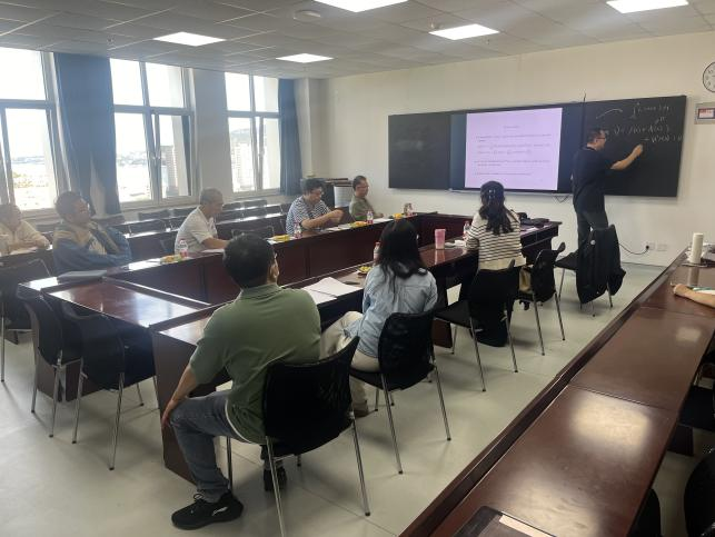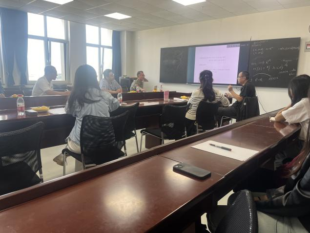 首先,綦建刚教授强调了谱理论不仅是重要的基础理论,更需在实际问题中寻找其应用的价值与潜力,为科研创新开辟新路径。随后,胡锡俊教授作为特邀嘉宾,以其深厚的研究功底和前沿的学术视野,详细介绍了自己的研究工作中用到的谱理论结果,特别是Morse指标和Maslov指数在特征值问题中的创新应用。这些理论成果为解决复杂系统的动力学行为提供了新的视角和工具。他的分享不仅赢得了在场学者的热烈掌声,也激发了大家对谱理论应用前景的浓厚兴趣。在会上,綦建刚教授与胡锡俊教授关于奇性哈密顿系统进行了讨论,部分老师和学生也就自己在科研中遇到的问题向胡锡俊教授请教,得到了胡锡俊教授的专业指导和建议。