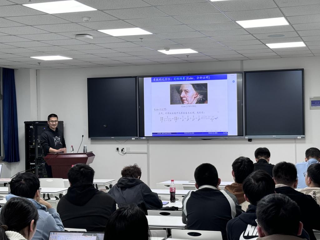 王子豪老师围绕素数分布与L-函数这一主题,由浅入深地为同学们进行了讲解。他从数论中素数的定义出发,介绍素数定理、哥德巴赫猜想等内容,同时阐述了L-函数的相关知识及其与素数分布的紧密联系。他回顾了自己的求学生涯,鼓励在场学生脚踏实地,潜心研究,在数学领域纵深探索。