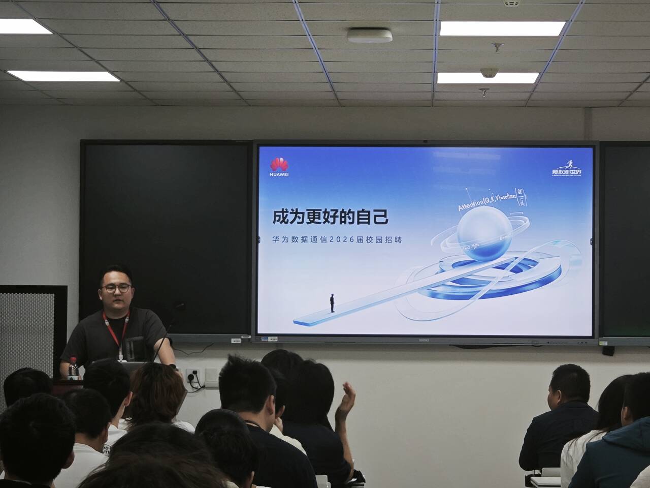 数据通信技术专家王锡森以多位华为天才少年的奋斗历程和多个工作中常见的算法问题为例,生动详细地解析了华为数通技术人才的招聘需求。他强调,扎实的数学基础、过硬的逻辑思维、系统的编程训练等是求职者顺利通关的法宝,同学们要不断提升专业能力,主动适应行业发展趋势。随后,数据通信路由器产品部项目经理管培国介绍了万象城娱乐awc线路华为数通拔尖人才创新实践基地的建设过程和运行模式,深入剖析了实习基地各个岗位的能力要求,帮助同学们更直观地了解岗位职责与成长路径。最后,数据通信路由器招聘负责人许碧绿等详细讲解了华为的校招流程、选拔标准及实习基地培养机制,鼓励同学们结合自身优势,做好职业规划,精准定位未来方向。在互动环节,同学们就职业发展、技能提升和面试技巧等方面踊跃提问,嘉宾们一一耐心解答,现场气氛热烈。