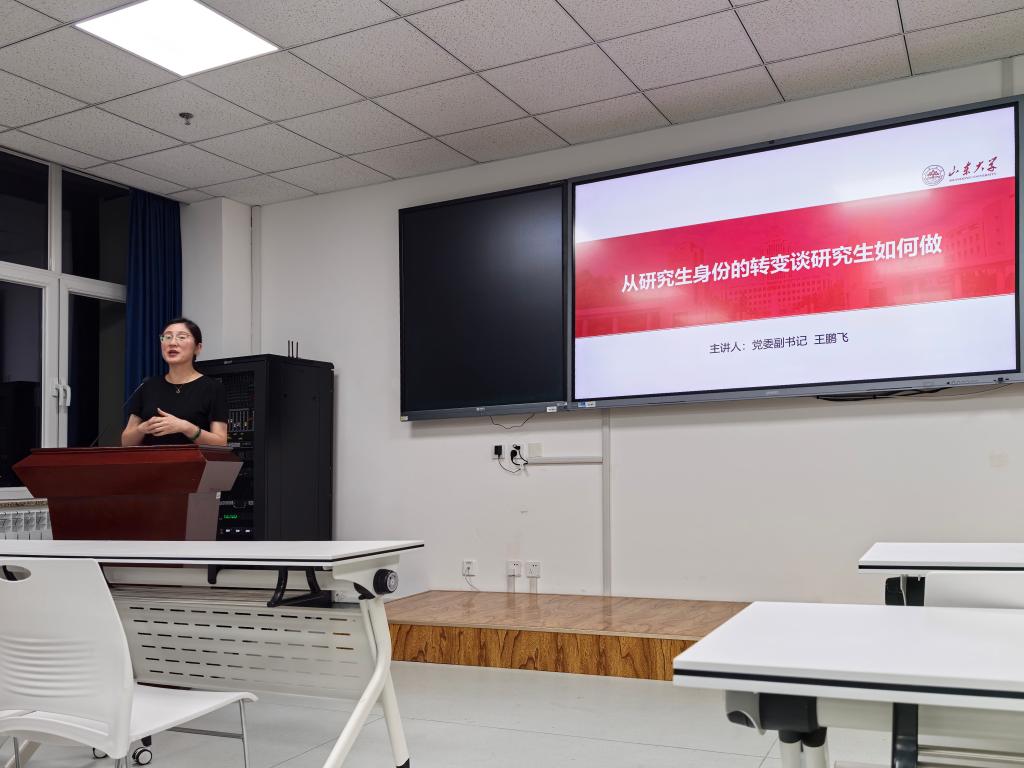 王鹏飞结合研究生身份的转变重点强调了研究生的阶段性特点和发展要求。她教育研究生要增强“山大人”的身份认同,注意文明举止,慎言慎行共同维护学校形象。她以“成年人、学生、社会人”三个身份为重点,勉励大家作为成年人要学会承担责任、自我负责,作为学生要学会生涯规划、遵规守纪,作为社会人要学会为人处世、自我管理。最后,王鹏飞鼓励学生合理建立三种关系,和导师亦师亦友,和同学成为亲密战友,和辅导员成为知心朋友。