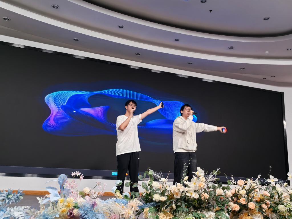 第三篇章“共赴启新程”展望了未来的学习生活与梦想的启航。数学类4班带来的《趣味配音》妙趣横生,展现了语言与创意的魅力,数据科学班歌曲表演《不为谁作的歌》深情动听,触动心灵,脱口秀《健身房里那些事儿》以轻松口吻讲述校园生活点滴,数学类1班话剧《别被套路了》寓教于乐,提醒新生防范风险,数学类2班歌唱剧目《淋雨一直走》以动人旋律传递了不畏风雨、勇敢前行的信念。最终,风采晚会在数理音籁合唱团与观众们共同高歌的《我爱你中国》中深情落下帷幕,激昂的歌声抒发了深厚的爱国情怀。