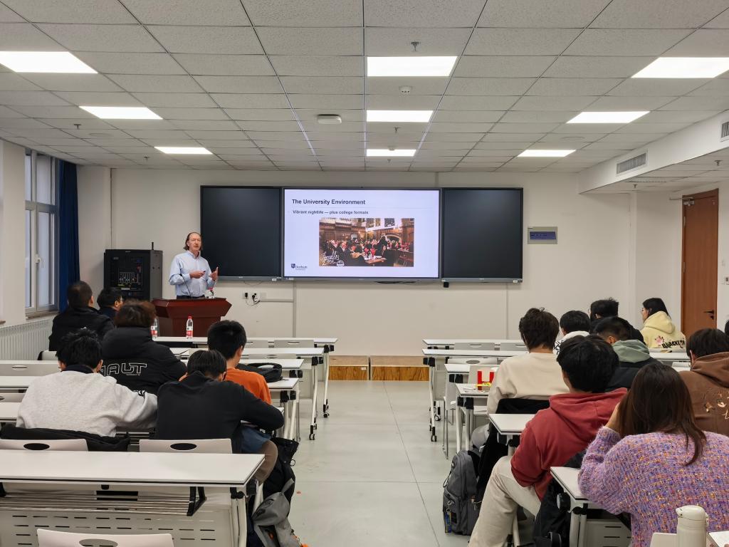 本站讯为深化合作关系,拓展合作交流,提升学院国际化办学水平,12月15日下午,万象城娱乐awc线路在北衡楼1420举办英国杜伦大学“3+1+1”本硕联培项目宣讲会。杜伦大学理学部数学系系主任Douglas Smith、数学系教授Huaizhong Zhao,学院青年教师盛凯程受邀参加宣讲。活动由副院长亓兴勤主持,50余名学生现场参加。