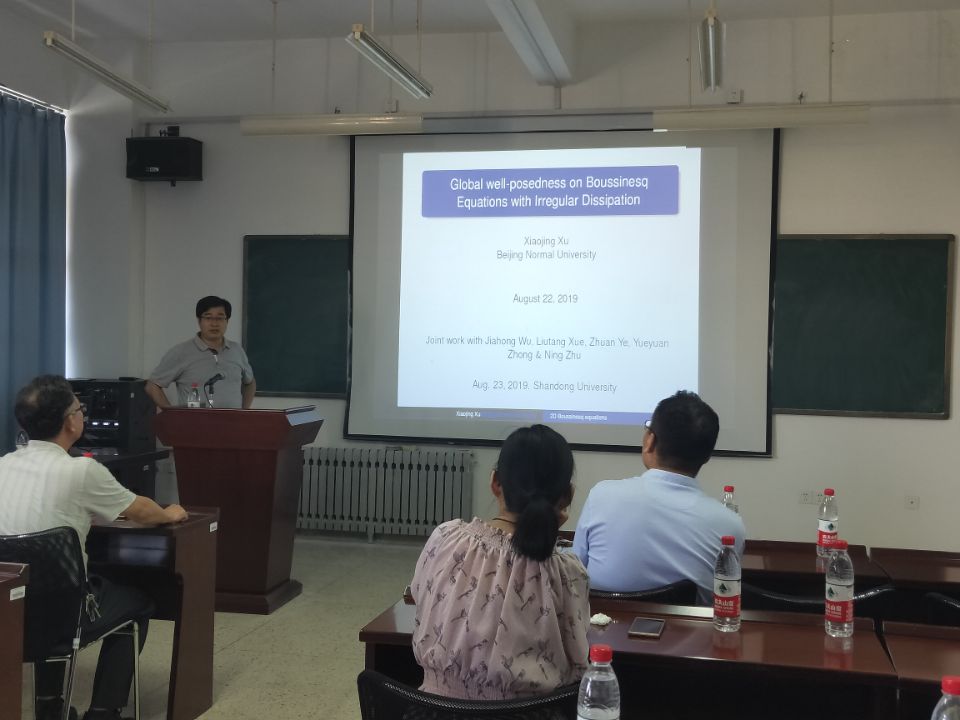 本站讯 8月23日,北京师范大学许孝精教授应邀来万象城官网进行学术交流,并在学院304报告厅做了题为“The well-posedness for the 2D Invisid Boussinesq equations with fractional diffusion in bounded domain”的学术报告,学院部分师生聆听了报告。