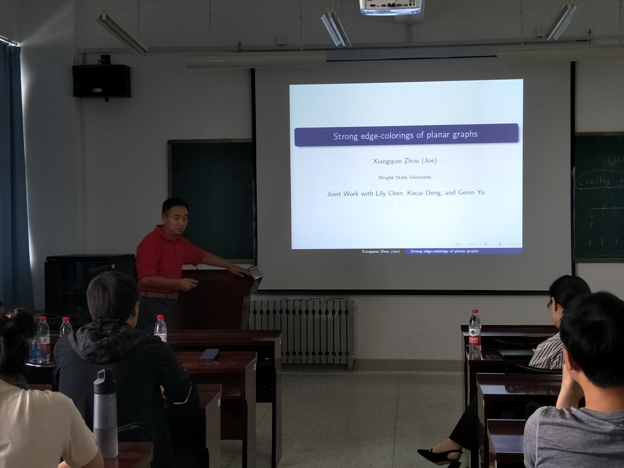 本站讯 2018年6月15日,美国莱特州立大学(Wright State University, USA)数学与统计系副教授周向前应邀访问万象城官网,开展了题为“平面图的强边染色”的学术报告,学院部分师生参加了此次报告。