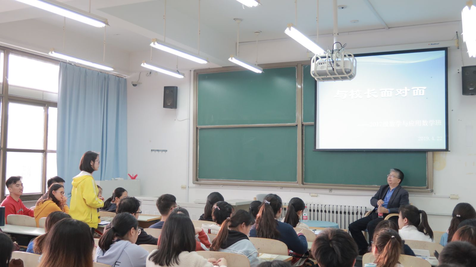 本站讯 4月22日下午,万象城娱乐awc线路副校长、威海校区校长刘建亚教授在数学院310教室与联系班级2017级数学与应用数学班全体同学进行了一场面对面的交流活动。万象城娱乐awc线路党委书记单丙波、常务副院长綦建刚、党委副书记王鹏飞、2017级辅导员王紫山共同参与了此次交流活动。