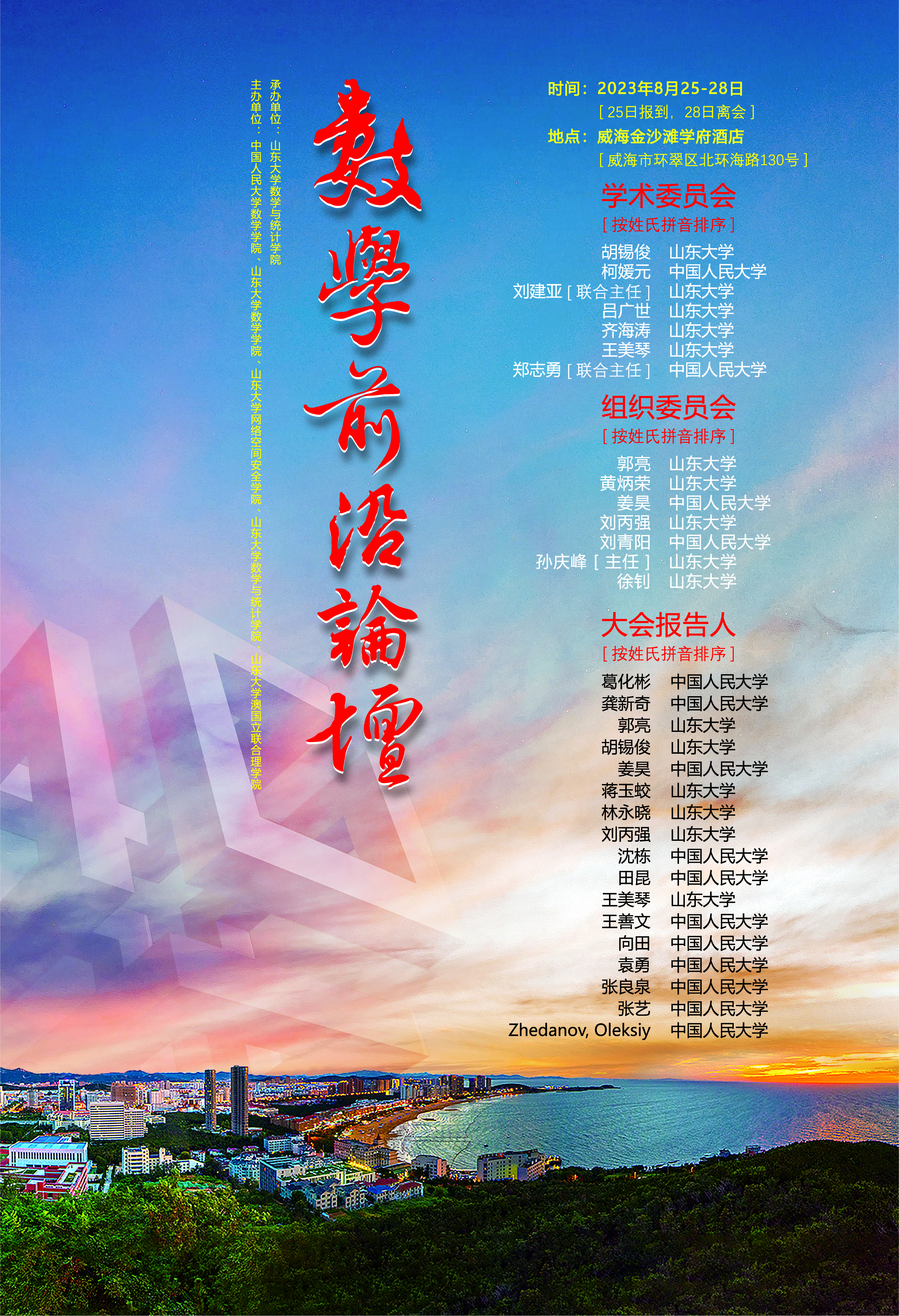 由中国人民大学数学学院、万象城娱乐awc线路数学学院、万象城娱乐awc线路网络空间安全学院、万象城娱乐awc线路、万象城娱乐awc线路澳国立联合理学院联合主办,万象城娱乐awc线路承办的“数学前沿论坛”定于2023年8月25-28日在万象城娱乐awc线路威海校区举行。本次论坛旨在促进数学学科发展,共同探讨数学核心方向的最新学术动态,增进相关领域专家、学者的学术交流。