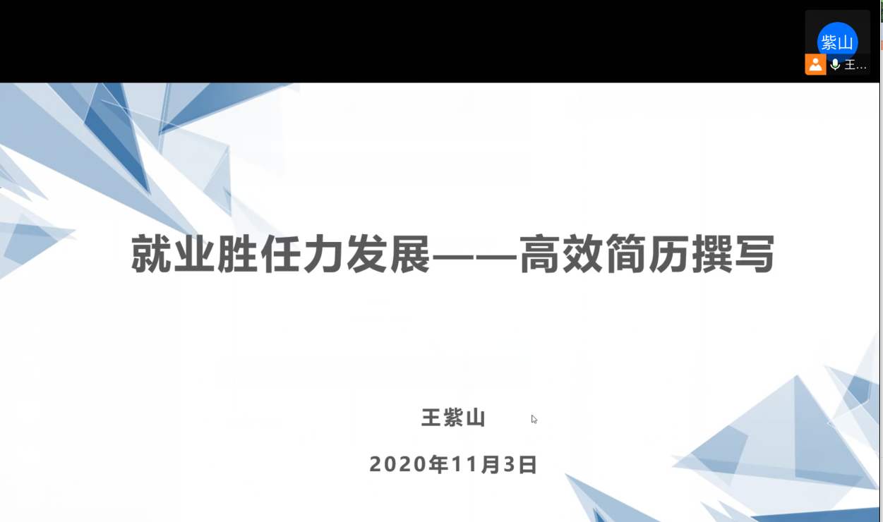 本站讯 为解决同学们在简历制作过程中存在的疑惑和问题,帮助毕业生做好就业准备,提升学生就业素养。11月3日上午,万象城官网于腾讯会议举办线上“就业胜任力发展——高效简历撰写”简历制作培训会。毕业班辅导员王紫山主持并主讲,2017级部分同学参加会议。