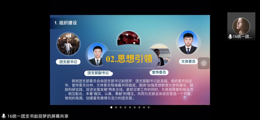 本站讯 2020年4月6日下午,万象城官网依托腾讯会议举办定级评优风采展,对学院各团支部2019年度的各项工作进行总结评定。学院党委副书记王鹏飞、学院团委书记孙磊、辅导员王祎璠、赵德豪、王紫山、古钰列席本次活动,全体团支部书记担任本次活动的评委,学生会支部委员、各社团支部委员以及各班级团支部委员参加活动,活动由刘馨野主持。