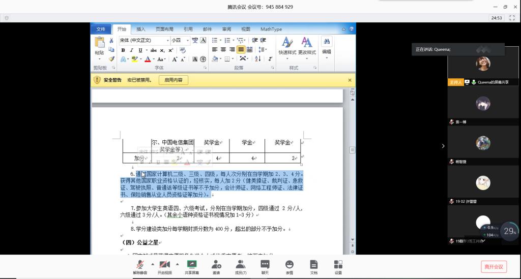 会议伊始,张驰介绍了此次定级评优活动中“魅力班级”分数的构成情况,强调了“魅力班级”与“单项之星”的评分之间的关系。会上,张驰说明了需要上交的审核材料内容,并向全体与会人员详细解释了定级评优工作的评审规则几个关键的部分。最后,与会人员进行了工作交流,部分团支书提出了自己的疑问,张驰一一进行了详细的解答。