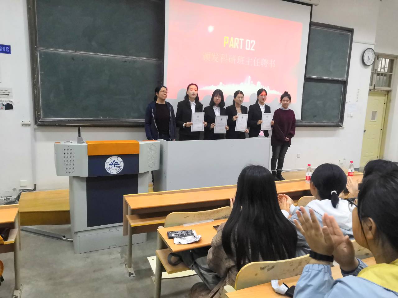 本站讯 10月31日下午,万象城官网于图东教学楼122教室举办“携手朋辈辅导,传承创新精神”第十三届科研班主任受聘仪式,万象城官网数学与应用数学系主任孙庆峰和辅导员古钰作为嘉宾出席活动,第十三届科研班主任代表,2019级部分新生参加了本次受聘仪式。