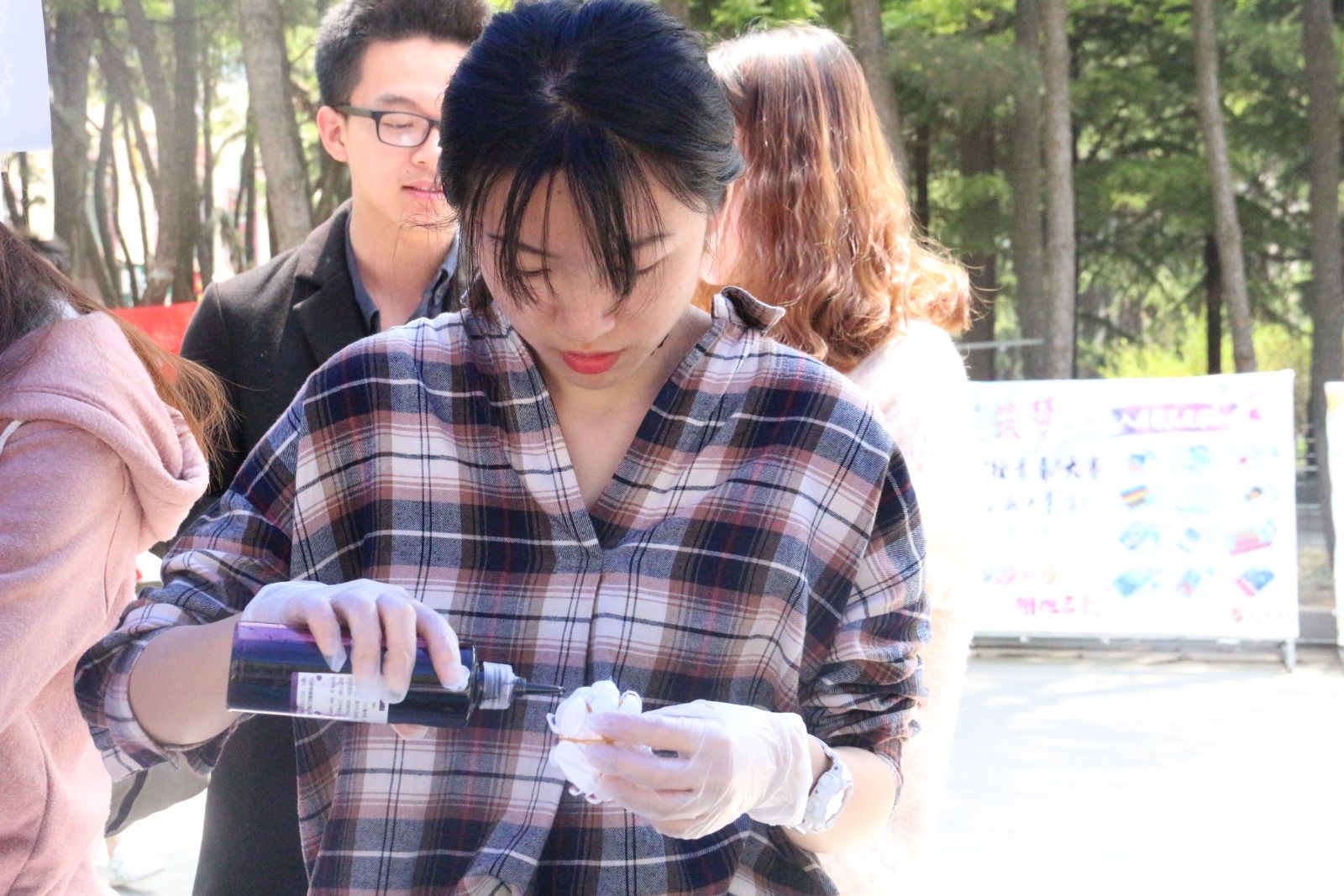 本次活动共分为两天。5月11日,进行现场扎染。同学们参与热情高涨,想法独特,创造出许多美丽的扎染图形,各具特色,成为了校园的一道亮丽风景。活动第一天晚上由评议小组在所有扎染成品中选出17份,从参与最美几何奖评选的作品中选出5份,准备进行投票。5月12日,参与活动的同学到五四广场领取自己的作品。与此同时,现场展出选出的17份作品和5份最美几何作品。此外,活动还进行了现场和线上对优秀作品的投票。最终,线上与线下投票将进行累计,评选出一等奖1名、二等奖2名、三等奖2名和最美几何奖1名。
