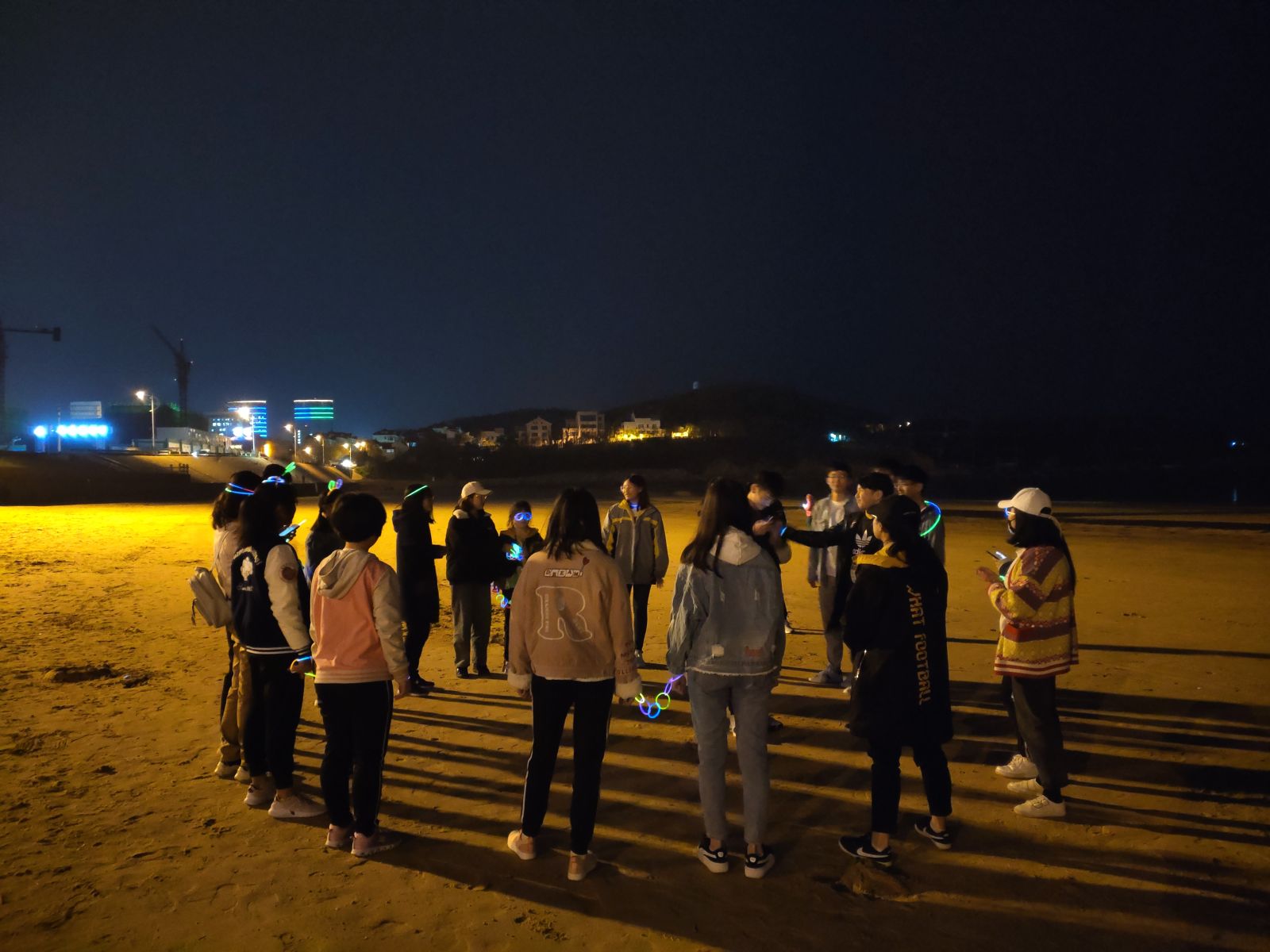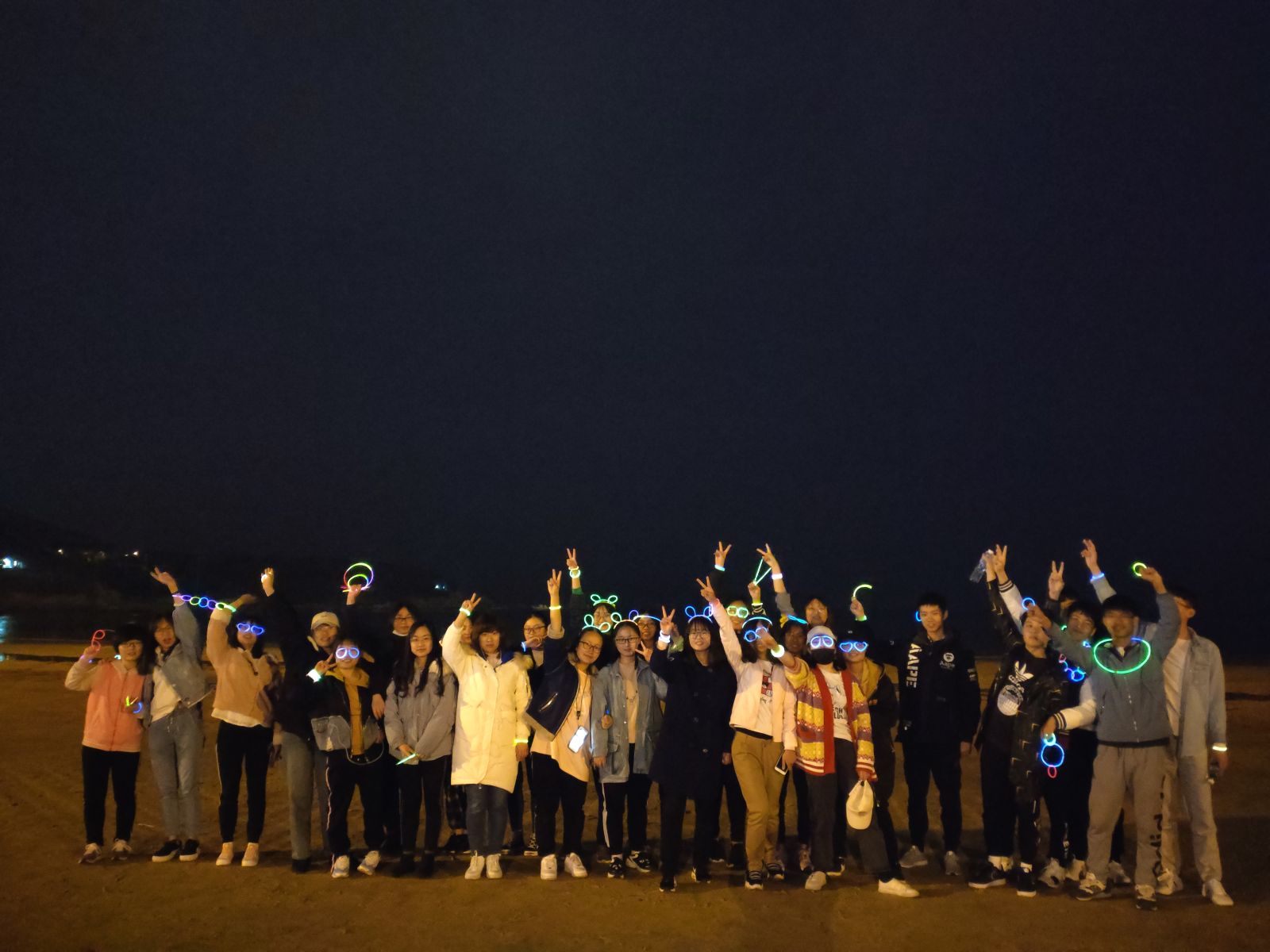 晚上七点整,统计一班荧光夜晚跑成员换上运动装,在宿舍楼前集合完毕,同学们按照文体委员赵光凯提前规划的路线,向金海滩行进。跑步过程中,同学们秩序井然并相互鼓励,紧跟大队伍,安全抵达金海滩。接着,同学们在沙滩上进行了击鼓传花等小游戏,并加入了海滩旁气氛火热欢快的广场舞大队伍。活动的最后,本次荧光夜跑全体成员集体合影,大家沿另一条提前规划过的路线一路慢跑安全抵达学校。