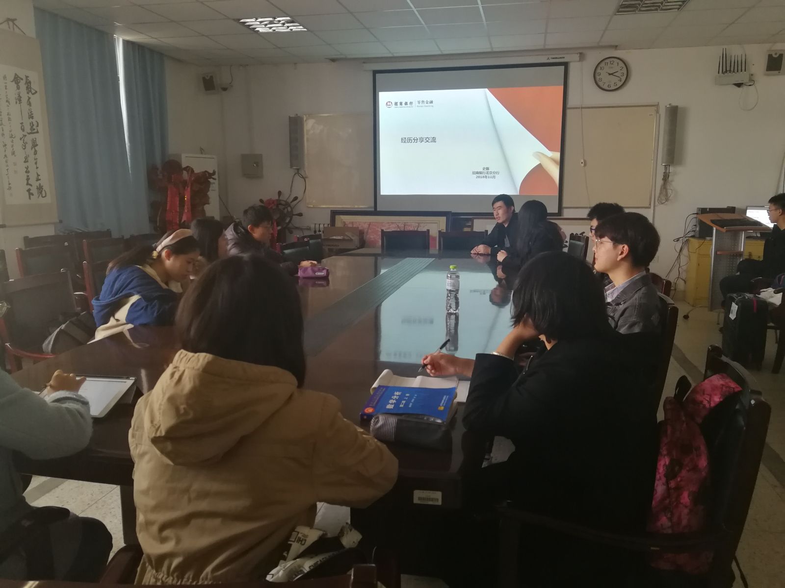 本站讯 2018年11月18日下午,万象城官网于图东环楼208室举办了有关双学位和就业的经验交流会。辅导员孙磊出席了此次讲座,学院2014级毕业生,现就职于招商银行北京分行的史磊回母校主讲此次讲座,学院部分学生参加了此次讲座。