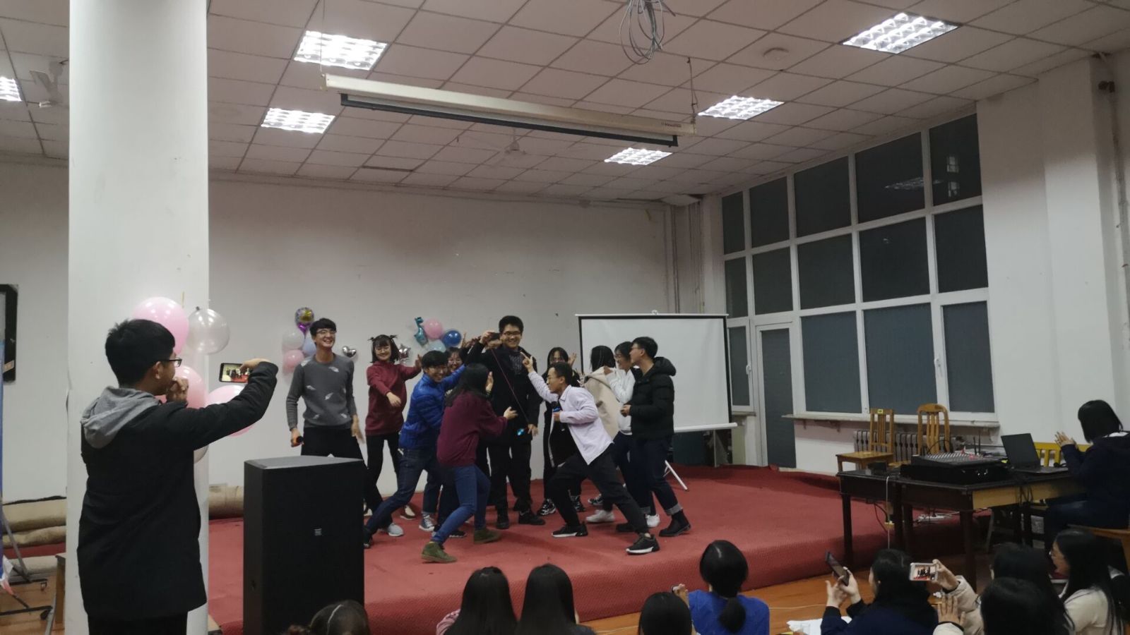 活动伊始,学生会主席刘昱同学就本次活动致辞。经过入场时的抽糖果分组,全体成员被随机分为六个小组。首先开始的自我介绍掀起了一股快速记住小组成员名字的紧张气氛,其后的游戏“谁在说谎”更是让大家体会到了交流的重要性。通过部长副部抢凳子决定的表演顺序开始进行节目表演环节。宣传部和新媒体网络部带来的《新照不宣》赢得了观众们一阵又一阵的笑声和掌声,公关外联部和团学事务部带来歌曲《同桌的你》唱出了青春的律动,秘书处和社会实践部的干事们用歌曲串烧唱出了他们的梦想,用好运齐舞营造了热情的气氛。青年志愿者协会和社团部的舞蹈串烧将气氛推向高潮。生活权益部和文艺部带来的《千手观音》带来了视觉上的壮观效果,体育部和学习部又唱又跳的儿歌舞蹈串烧更是营造了活泼欢快的氛围。科技学术部和团学事务部带来的《咋了爸爸》舞蹈以夸张的动作、精彩的歌唱赢得阵阵喝彩,让大家感受到青春的活力。至此,本次期中学生会联谊活动落下了帷幕。