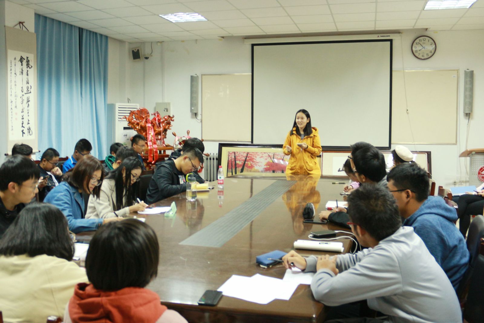 会议伊始,吕靖介绍了本次分享会的主要内容,分享如何更好地处理班委、同学间的人际关系,正确处理学习与工作的关系,实现学习与工作双赢。张弛以“自律自省,不忘初心”为题进行了事迹分享,强调了树立目标的重要性。侯佳慧和李昊昱分别从不同角度指导班委们如何更好地处理班委间、同学间的人际关系,提出礼貌尊重,懂得沉默等具体建议。李想就自身经历及建议,对如何正确处理学习与班委工作的关系分享了自己的见解,提出“今日事,今日毕”“登高山须攻绝顶,赏大雪莫畏严寒”的观点,强调要不畏艰难险阻和失败,及时完成自己的工作和学习。最后,进入答疑解惑环节,班委们踊跃发言提出疑问,由孙磊及17级学生干部对每个问题分别进行解答,分享会在掌声中圆满结束。