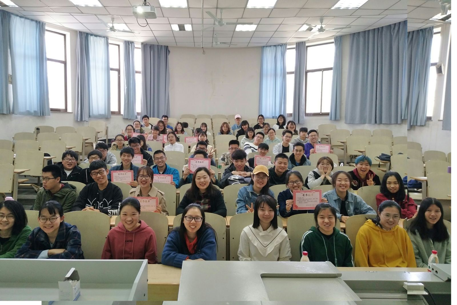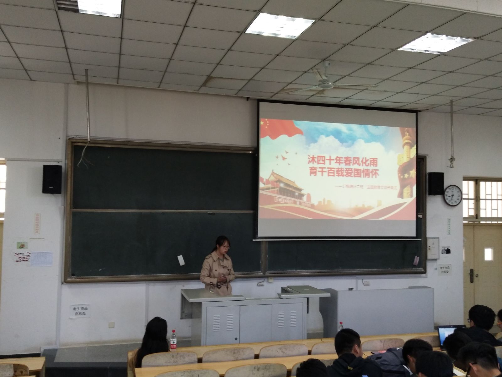 本站讯 2018年4月27日上午,2017级统计二班于图西126举办了“沐四十年春风化雨,育千百载爱国情怀”主题教育立项活动开幕式暨班级先锋表彰大会。学院党总支副书记单丙波、辅导员陈昕出席了会议,会议由团支书刘文婕主持,班级全体同学参加。