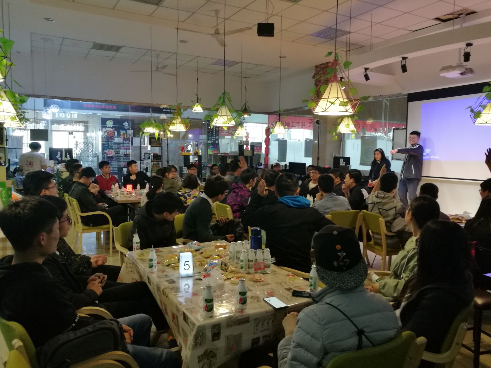 下午两点,活动正式开始。首先,张鼎铄通过PPT和同学们一起回顾往期心理班会。随后,同学们通过抽签分为五组进行游戏,由闫欣、张鼎铄介绍游戏规则。第一个游戏是“听歌识曲”,各组听歌抢答,答对得分。第二个游戏是“数7”,一组人轮流数数,逢含7的数字和7的倍数需要跳过。第三个游戏是“007”,一组同学随机指定下家,一次做与0、0、7相应的动作。为了增加游戏趣味性,在分组时两位心委还在每组设置了“卧底”。游戏环节有序而热闹地进行,各组同学都表现得十分积极,既展现了同学之间的默契,又表现出同学们的机敏。每个游戏环节,优胜小组都有丰厚奖品。游戏结束时,各组投票选出“卧底”,选对的组获得了礼物。接下来,同学们边享用美食边聊天、欢唱,有的组还玩起了歌曲接龙,活动达到最高潮。最后,全体同学打扫卫生,本次班会活动落下帷幕。