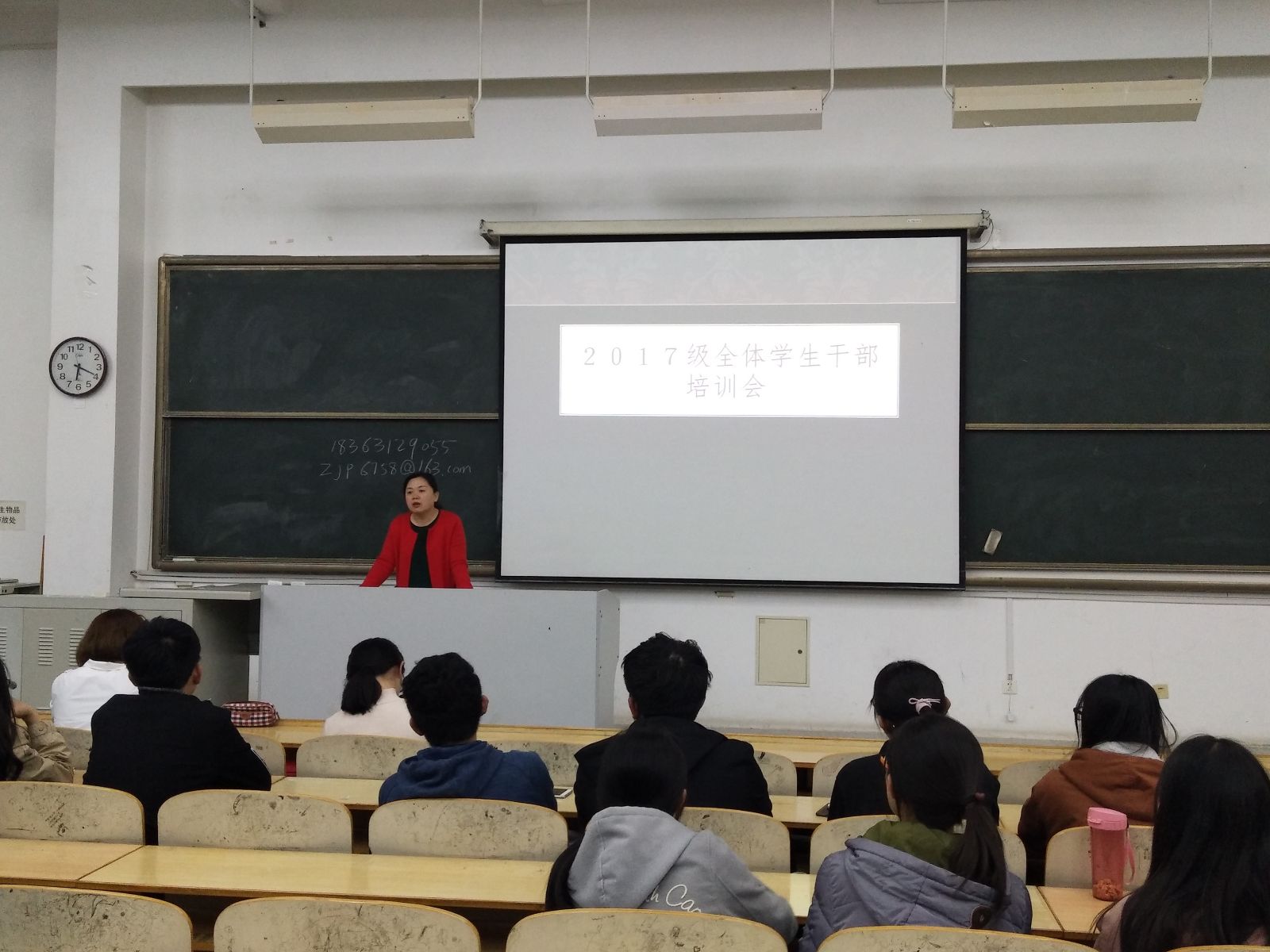 本站讯 4月13日下午,万象城官网于电子楼202召开了2017级全体学生干部培训会。2017级各班全体学生干部参加了大会,大会由2017级学生辅导员陈昕主持。