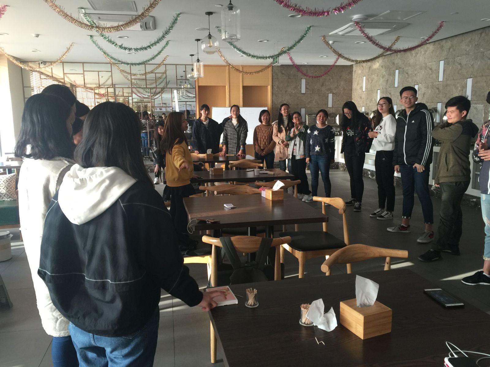下午四点整,班级全体同学在蒙牛广场集合,在王祎晨的组织下前往沃德酒店活动厅。四点一刻,活动准时开始。本次心理班会分为四个部分。首先,曾德玲为同学们介绍了本次活动的流程和内容。随后,进入集体游戏环节。第一个游戏为“击鼓传花”,按照游戏规定,喊停时“花束”在手的同学上台表演,整个游戏过程紧张而兴奋,被罚同学的表演也给大家带来耳目一新的感受。第二个游戏为“萝卜蹲”,由全体同学分成四个小组各组组织进行。同学们为自己取出各种搞怪创意的“萝卜名字”,随着游戏的进行,活动厅内不时发出阵阵爆笑。结束了集体游戏环节,在稍事休息后,便是自由的桌游部分。一起经历过“狼人杀”的烧脑,“逢五落”的刺激,“三国杀”的紧张后,同学们之间的关系更加亲密。在心理班会结束即将结束前,王祎晨组织同学们将活动过程中产生的垃圾进行清洁,并将桌椅进行摆放整理。晚八点,本次心理班会在大家的欢声笑语中落下帷幕。