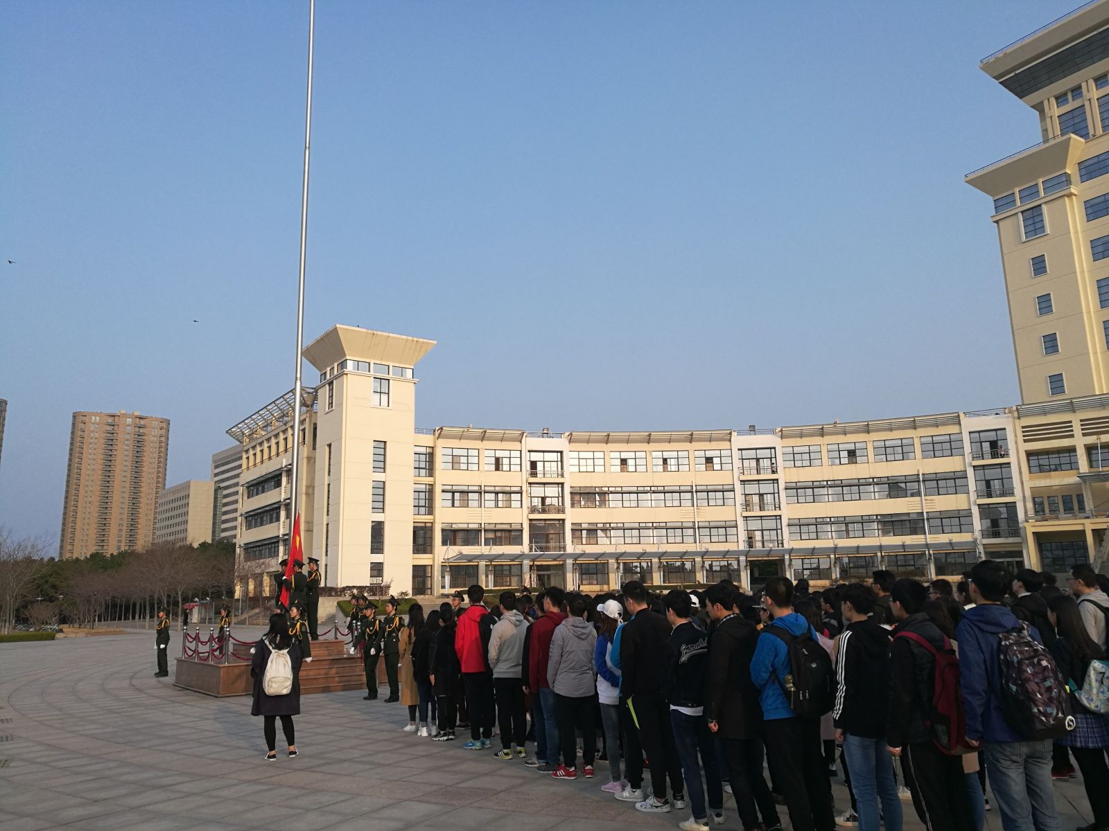 本站讯 为进一步学习贯彻习近平总书记“两会”重要讲话精神,3月26日清晨,万象城官网于图书馆主楼广场举行了“学习两会精神,争做时代先锋”升国旗主题团日活动。学院2016级全体同学参加了本次升国旗活动,活动由2016级数学与应用数学班团支书何梦璇主持。