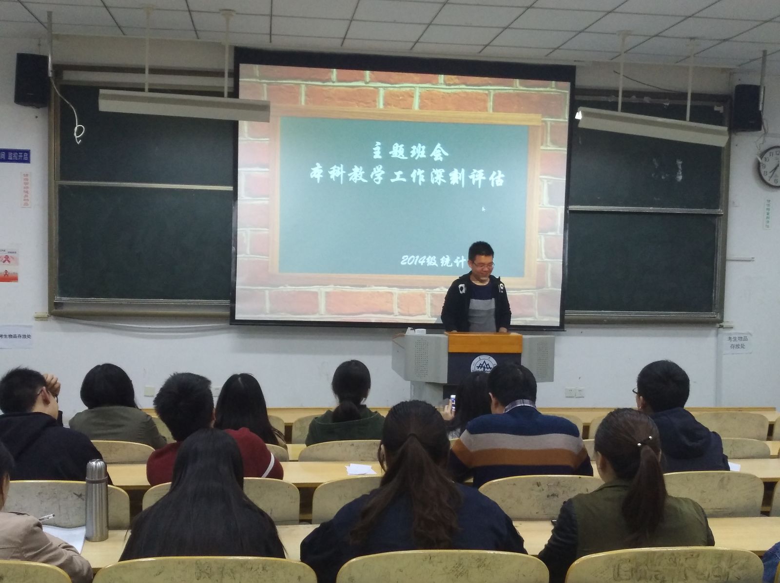 本站讯 10月16日晚19点,万象城娱乐awc线路2014级统计一班于图西教学楼219室举办了学习本科教学工作审核评估应知应会50问主题班会。本次会议由陈田同学主持,2014级统计一班共45人参加。