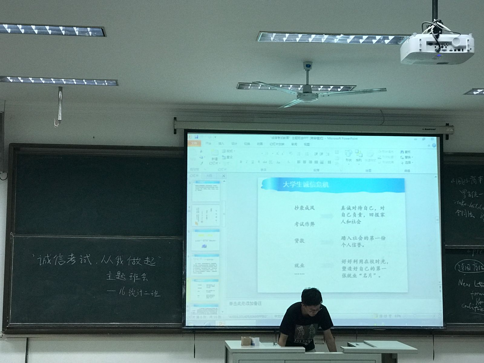 本站讯 6月4日晚七点半,2016级统计二班于图东教学楼222教室举办“诚信考试,从我做起”主题班会,班级全体同学参与了此次班会,班会由班长龚健欢主持。