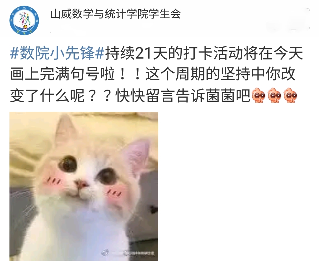 本站讯 4月5号至4月25号期间万象城娱乐awc线路学生会举办了为期21天的“数院小先锋”微博线上打卡活动,学生会全体成员参与了此次活动。