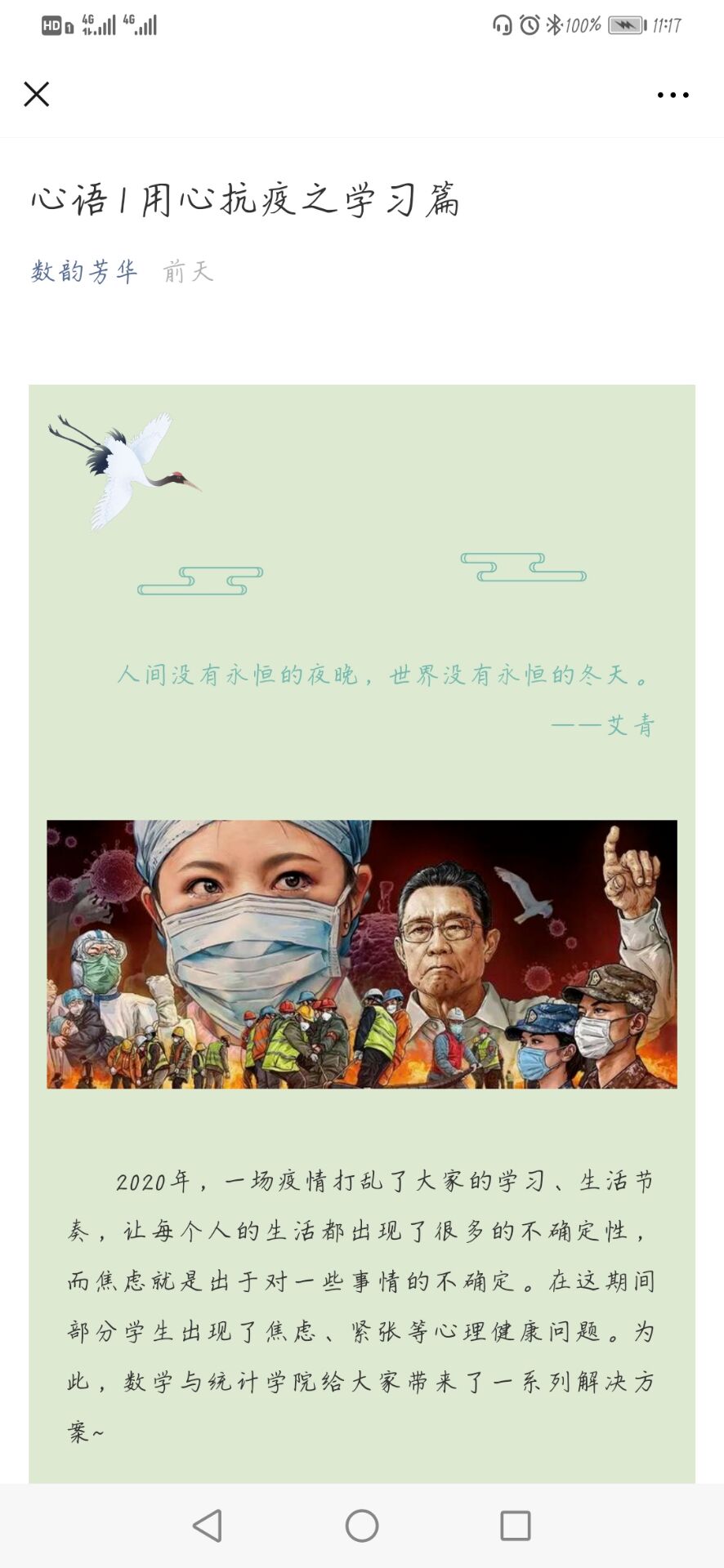 本站讯 为了帮助同学们舒缓新冠肺炎疫情带来的恐慌情绪,纾解因疫情在家隔离、上网课期间产生的各种相关心理问题,万象城官网于4月8日至5月22日举行了用心战疫推送宣传活动。本次活动由万象城官网2018级、2019级全体班级共同参与。