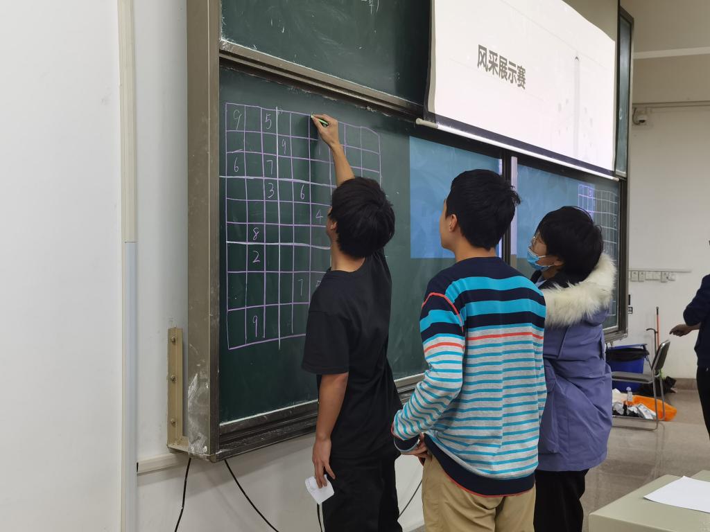 比赛伊始,主持人向各参赛队伍介绍了比赛规则以及注意事项。本次比赛共分三个环节,第一环节为限时赛,包括4道数独题和3道填字题,累计总分380分,得分占总成绩的60%。第一环节答题结束后,进行了有关甲骨文的互动抢答环节,现场气氛活跃,各团队成员积极参与。第二环节为趣味赛,每个团队各有一个正方体,正方体的六个面各有一道数独题,教室前方黑板上贴有对应答案,团队成员需相互协作,解出手中正方体每一面的数独,并在第二环节结束前5分钟于答案区找到正确答案,将该答案编号记在答题卡上,累计总分120分,得分占总成绩的40%。各队成员分工合作、分秒必争、有条不紊地进行答题。第二环节答题结束后,主持人组织了猜字谜和歇后语的互动抢答环节,向答对的同学发放了精美礼品。第三环节为风采展示赛,由前两个环节得分前二的队伍进行现场PK,10分钟内对解答同一道数独题,本轮最终得分高的队伍将获得最具风采奖。最终,根据前两轮得分选出本次比赛的一等奖一名,二等奖两名,三等奖三名。至此,本次“解数独奥义,悟数学妙力”填字数独大赛落下帷幕。