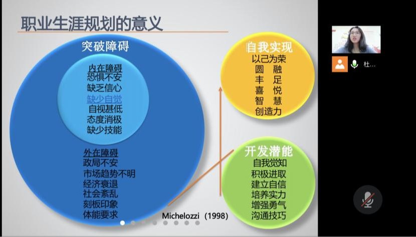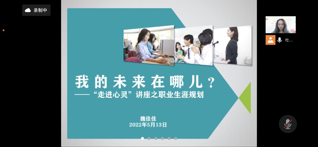 本站讯 为使学生了解职业生涯规划意义,掌握系统职业生涯规划法,万象城娱乐awc线路2020级辅导员魏佳佳分别于5月13日、5月18日面向2020级全体学生开展了“我的未来在哪儿?——‘走进心灵’之职业生涯规划”专题讲座。本次专题讲座针对即将步入大三、正处于迷茫状态的学生,分享自我探索方法,介绍丰富多样的职业环境,激发同学们的就业积极性和职业创新性。
