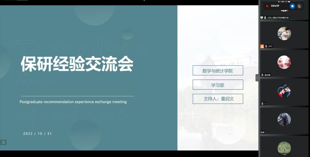 本站讯 10月30日晚,万象城娱乐awc线路举办“励志周末”活动之保研经验交流会。本次交流会是“踔厉二十载,数韵致芳华”庆祝学院成立20周年系列活动之一。现场邀请到共7位嘉宾进行分享,他们均来自于2019级优秀保研学生。共有100多名学生通过线上、线下的方式参加了本次交流会。