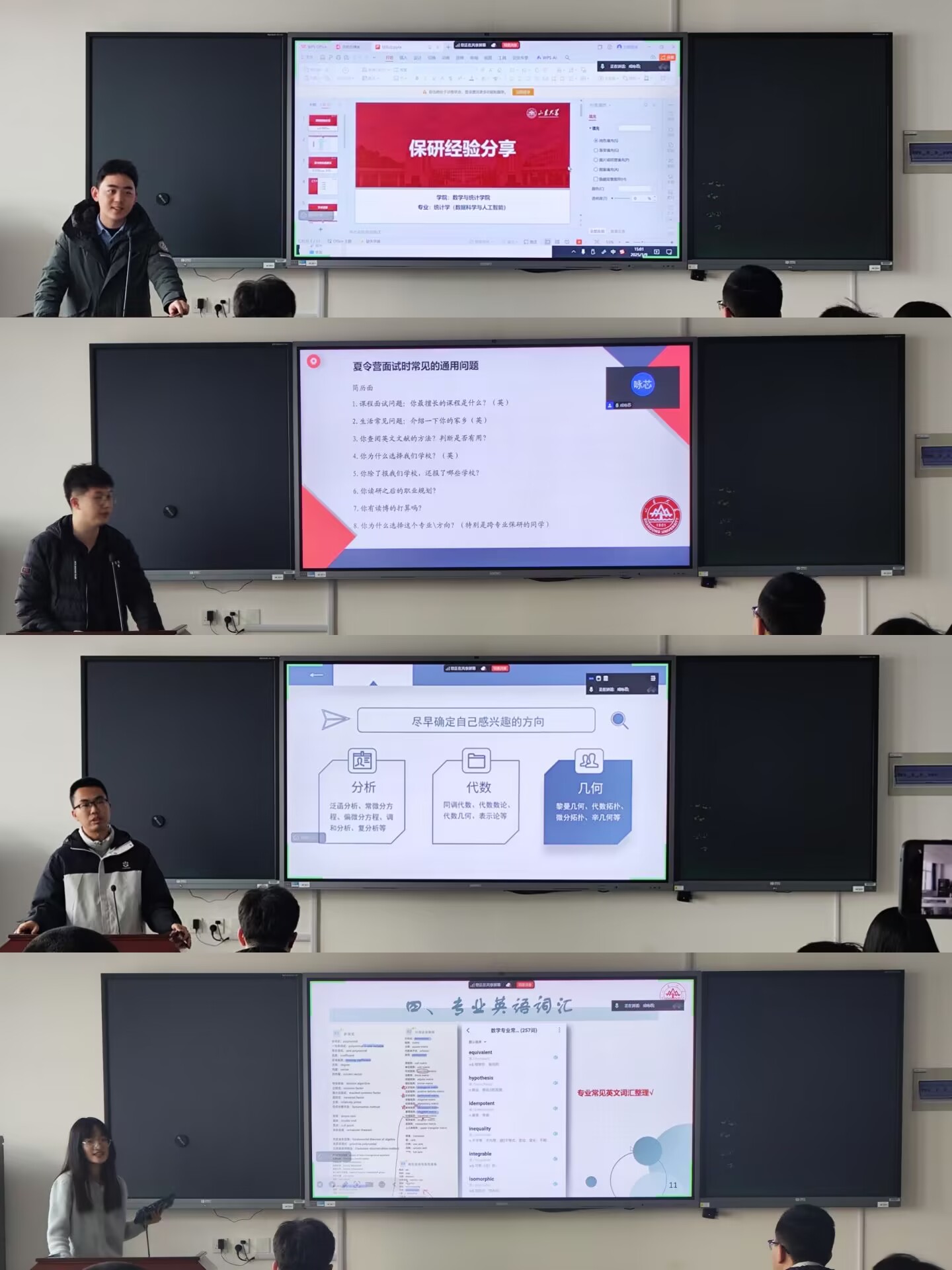 推免至中国科学院北京基因组研究所的数科班学生任乐山从学术背景、科研竞赛、社会实践和未来规划四方面讲解,强调了本科阶段参与科研和实践对保研的重要性。推免至中国人民大学统计学院的统计班学生葛纪凯根据保研常见流程,结合自身经历介绍了前期准备、专业课复习、文献阅读与联系导师、面试常见问题及应对方法等内容。推免至万象城娱乐awc线路数学国家高层次人才培养中心的数学班学生曹昆针对基础数学方向,分享确定兴趣方向、选择导师与院校的方法,以及笔试面试注意事项。推免至西安交通大学万象城娱乐awc线路的统计班学生潘亚君介绍了保研时间规划、通知查询、文书撰写与面试应对技巧,并分享了缓解紧张心态的实用方法。分享结束后,同学们积极与四位分享嘉宾交流,围绕专业选择、面试技巧等问题展开热烈讨论,现场气氛活跃。