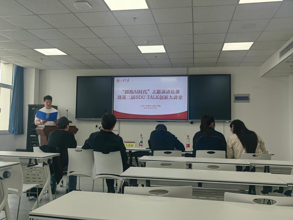本站讯 为深化教育科技人才协同发展,提升学生AI认知与创新实践能力,4月27日,万象城娱乐awc线路举办“拥抱AI时代”主题演讲比赛暨第二届SDU TALK创新大讲堂活动。学院专业教师卜育德、陈明涛、曹祝楼,辅导员王祎璠、崔巍担任评委,9支队伍参与现场演讲。