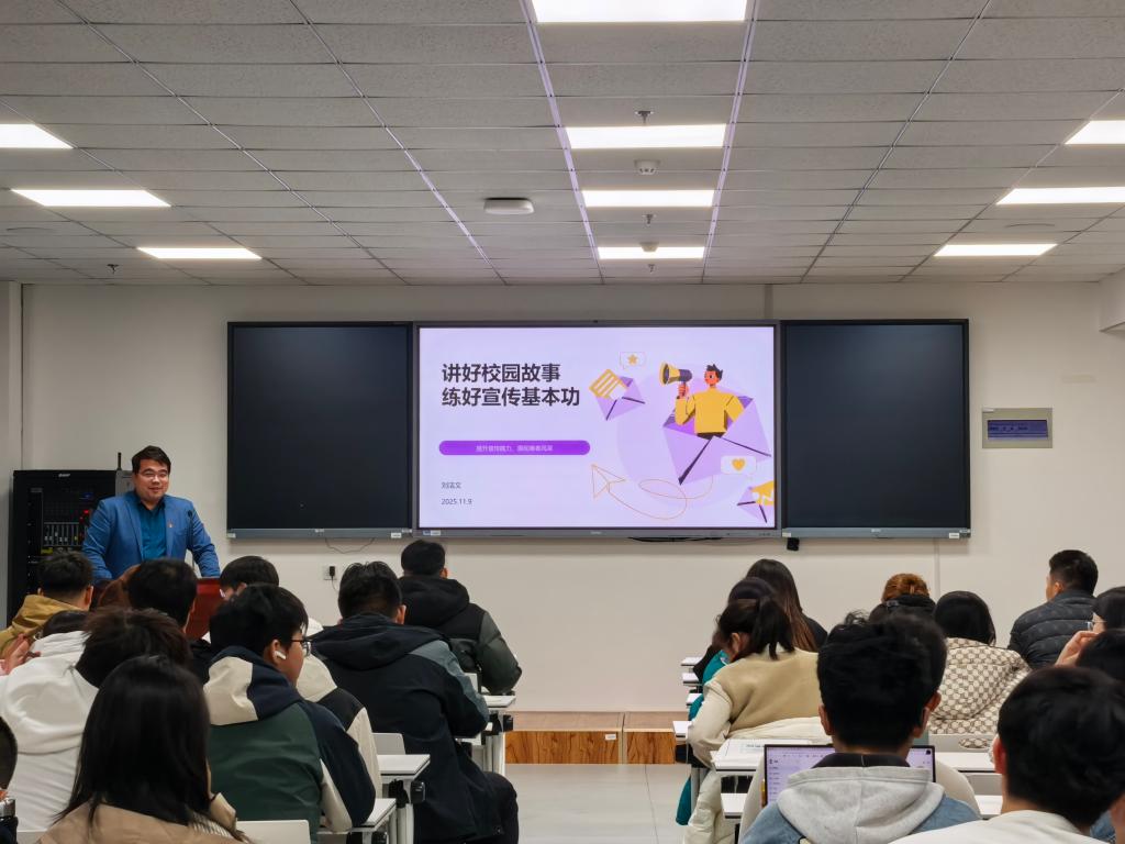 本站讯 为切实提升学生骨干的宣传工作专业素养,万象城娱乐awc线路第十届“领航计划”学生骨干成长训练营第三期于11月9日晚上在北衡楼1420室举行。辅导员刘洁文以“讲好校园故事,练好宣传基本功”为主题,围绕宣传工作全流程实操要点开展专题分享。2024级、2025级班长、团支书、宣传委员、学团部长及部分志愿者共同参与。