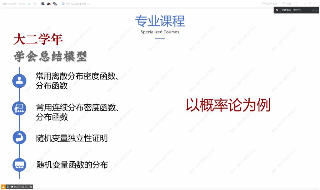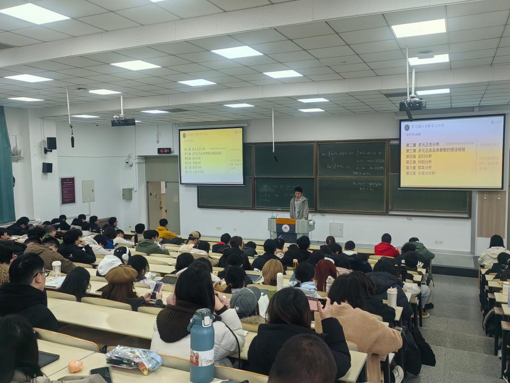 3月5日,张维佳为2023级学生讲解《多元统计分析》《时间序列分析》《贝叶斯统计》等专业课程的学习技巧。他梳理了各门课程的高频考点,分享了丰富的课外补充学习资料,并强调高年级课程更加注重知识的理解和应用,鼓励同学们勤学善思,努力提升用数学方法解决实际问题的能力。3月14日,范少飞为2024级学生讲授《数学模型》《数据结构》等专业课程的学习方法。他分享了课程各章节的重点知识和备考方法,并由课程内容引申至建模竞赛,引导同学们将课程与竞赛融会贯通,通过多种形式增进对知识的理解。3月22日,范少飞为2025级学生分享《概率论》《实变函数》等专业课程的学习经验,并结合专业分流政策梳理了各专业的课程特点与发展方向。他强调低年级课程注重打好基础,学会自行总结梳理的方法和思维。